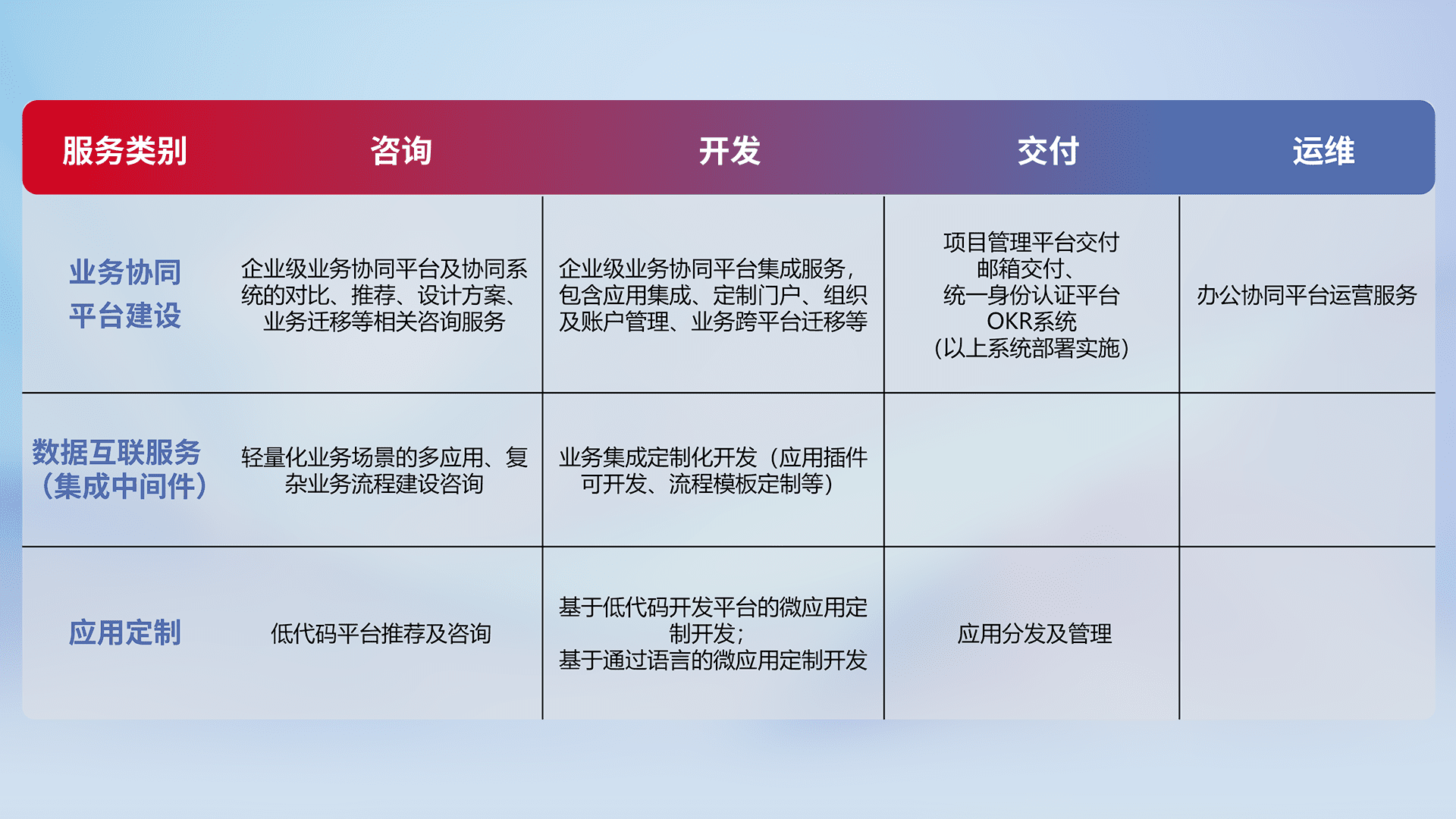 针对钉钉、、、、企微、、、、IDaas等平台级产品提供产品的规划、、、方案、、交付、、、定制化开发等服务,,,实现如统一协同办公、、、智能客户服务、、、混合会议管理、、、智能数据查询、、等业务场景,,实现数字化转型。。。