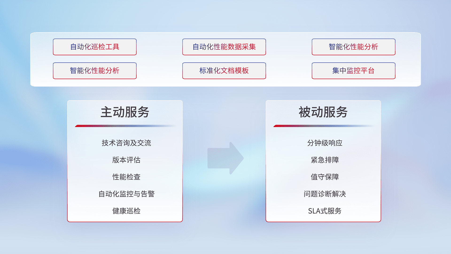 智能化工具和标准化文档,,保障服务质量,,,提供主动服务(包含技术咨询、、版本评估、、性能检查、、自动化监控与告警、、、健康巡检)和被动服务包含(分钟级响应、、、、紧急排障、、值守保障、、、问题诊断解决、、、SLA服务)。。。